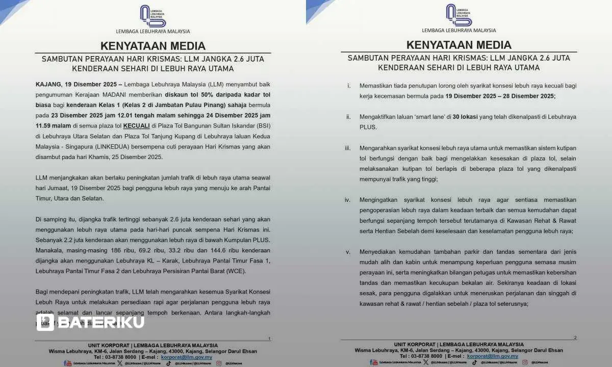 Malaysian highway users will enjoy a toll payment discount for two days on 23 and 24 December 2025 in conjunction with the Christmas celebration.